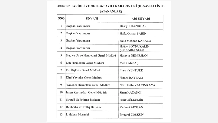 Diyanet İşleri Başkanlığı'nın atama kararları Resmi Gazete'de duyuruldu. Cumhurbaşkanı Kararı ile Hüseyin Hazırlar, Hafız Osman Şahin, Fatih Mehmet Karaca ve Hatice Boynukalın Şenkardeşler başkan yardımcısı olarak atandı. Diyanet'e yapılan yeni atamalar ve görevden almalar için detaylara göz atın.